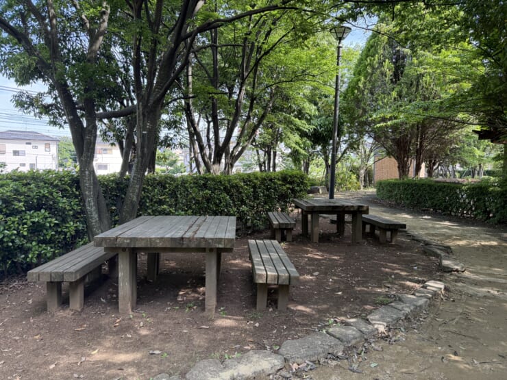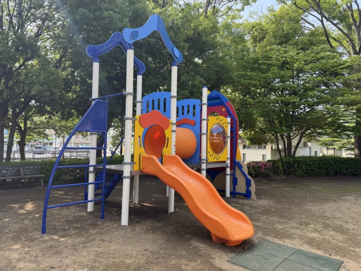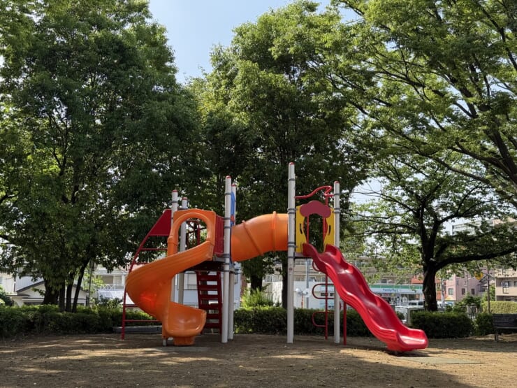 亀井下公園にはコンビネーション遊具が2つあり、木々の多い公園です。